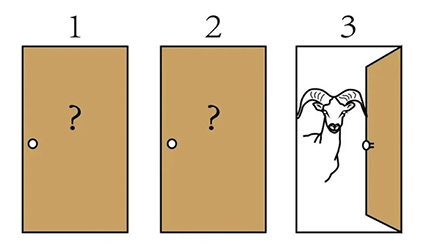 假设你正在参加一档真人秀电视节目,在你面前有三扇门。其中一扇门后藏有本期超级大奖——高级轿车一部,而剩下两扇门后则各有一只山羊。现在你随机选了其中的一扇门(1号门),但还没来得及打开它。节目主持人清楚地知道每扇门后面都是什么,他此时打开了另一扇门(3号门),3号门里是一只山羊。现在问你,要不要改变选择,从1号门换成2号门?