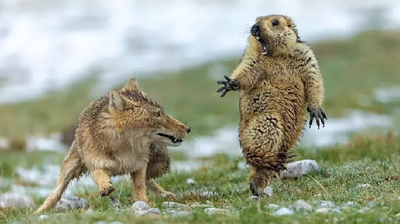 一只狐狸出其不意地向一只土拨鼠发动攻击