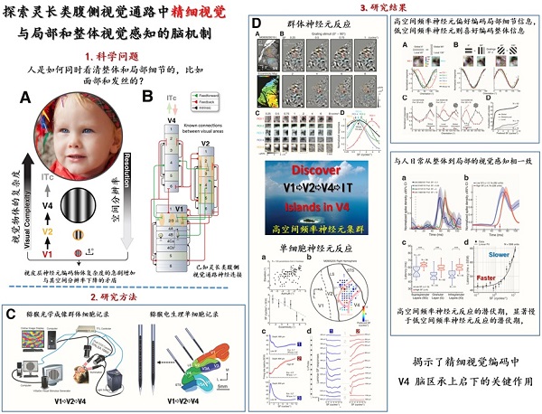 灵长类视觉系统通常被描述为一个从视网膜出发,由各个不同等级的视觉脑区组成的神经环路系统。初级和次级视皮层(V1和V2)神经元具有较小的时空整合感受野,偏好局部视觉信息,而从较高级视觉脑区V4和MT/MST开始,神经元普遍具有较大的感受野,适合整合较大视野内的视觉信息,从而完成整体视觉感知和认知功能。已有的教科书式的知识认为,在灵长类等级化的视觉系统中,伴随着神经元感受野的逐级增大,各个视觉脑区的最优空间分辨率逐级下降。那么精细视觉如何传递到高级视皮层如IT区进行物体识别和认知?这是视觉科学研究中的重大基础科学问题,至今没人能回答(图A和B)。