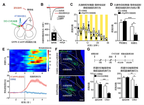 图1 脊髓-臂旁核环路参与痒觉信息传递。(A)脊髓电生理记录示意图。(B)电生理记录显示光诱发的兴奋性突触后电流,上图黑色为加药前,红色为加入拮抗剂后电流减小,下图为统计图。(C, D)光遗传学抑制脊髓到臂旁核投射降低组胺引起抓挠行为。C图为36分钟抓挠行为,黄色区域数据点为给予黄色激光抑制的抓挠行为,eNpHR3.0实验组明显低于对照组,D图为统计结果。(E)在组胺模型中,光纤钙成像记录臂旁核神经元的兴奋性与抓挠行为有相关性。(F)在臂旁核中注射实验组与对照组腺相关病毒的表达情况。(G)药理遗传学抑制臂旁核对痒觉诱发的抓挠行为的影响。上图为实验流程图,下图为抑制臂旁核明显降低组胺与氯喹诱发的抓挠行为。