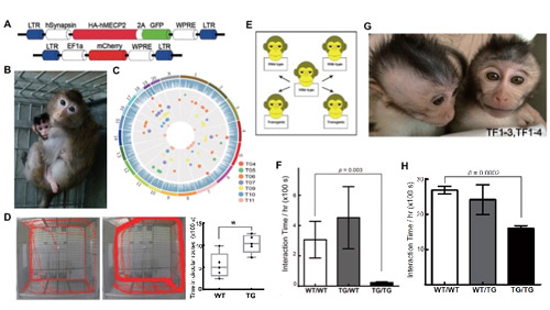 图注(A)人类MECP2外源转基因载体。(B)第一代F0转基因食蟹猴(怀中幼猴)。(C)F0代转基因插入位点的全基因组分布。(D)F0转基因食蟹猴运动模式的异常。(E)组群内社交行为分析的实验范式。(F)F0代在社交行为分析中的社交时间统计。(G)第二代F1转基因食蟹猴。(H)F1代在社交行为分析中的社交时间统计结果。