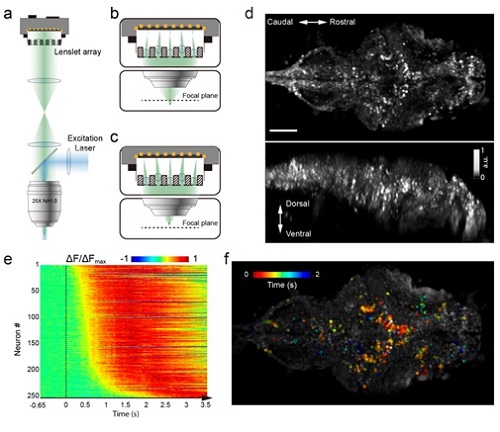 图1. XLFM斑马鱼幼鱼全脑成像。(a)XLFM示意图。微透镜阵列与物镜的后光瞳平面共轭。激发光为470 nm的蓝色激光。(b-c)不同竖直位置的点在相机上形成不同形状的图像,这些二维图像编码了物体的三维信息。(d)全脑细胞核标记GCaMP6f(huc:h2b-gcamp6f)的斑马鱼幼鱼的全脑最大强度投影(MIP)。(e)在t=0时刻光刺激后斑马鱼幼鱼不同神经元的荧光活动图,根据神经元的响应时间先后顺序进行排序。(f)(e)中的选定的神经元根据其响应的起始时间被标记了不同的颜色??潭任?00微米。