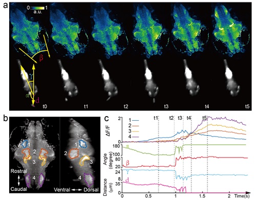 进一步地,他们将XLFM与高速三维追踪系统结合,成功捕捉到了斑马鱼幼鱼捕食行为下的全脑活动。斑马鱼的捕食行为由于涉及动机、感知、决策、运动控制、反馈等一系列复杂的神经环路功能,一直以来都受到神经科学领域的重点关注。然而,长久以来,人们受限于研究工具一直无法深入研究捕食行为背后的神经环路机制。而该工作的完成恰恰填补了这一缺陷,这将极大地促进对斑马鱼幼鱼捕食等复杂行为神经机理的研究,对人们更好地理解感知运动相关的神经环路工作机理具有重要意义。该技术进一步拓展后亦可大规模监测其他小型动物神经系统的活动。