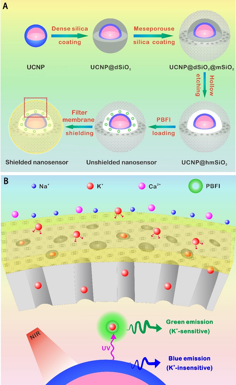 图注:钾离子纳米探针的设计以及感应机理。(A) 钾离子纳米探针的制备过程。上转换发光颗粒NaYF4:Yb/Tm@NaYF4:Yb/Nd 表面连续包裹一层实心二氧化硅和一层介孔二氧化硅??淌词敌亩趸璩闪粝碌目涨唤峁箍勺霸丶乩胱佑庵甘炯痢W詈?,外表面包裹一层钾离子特异性的薄膜即成钾离子纳米感应探针。(B) 钾离子纳米探针的感应机理。外层薄膜只允许钾离子进出纳米探针,同时排斥其他阳离子。在近红外光激发下,内核上转换发光颗粒发出的紫外光可作为钾离子荧光指示剂的激发光,从而赋予探针近红外光激发的功能。