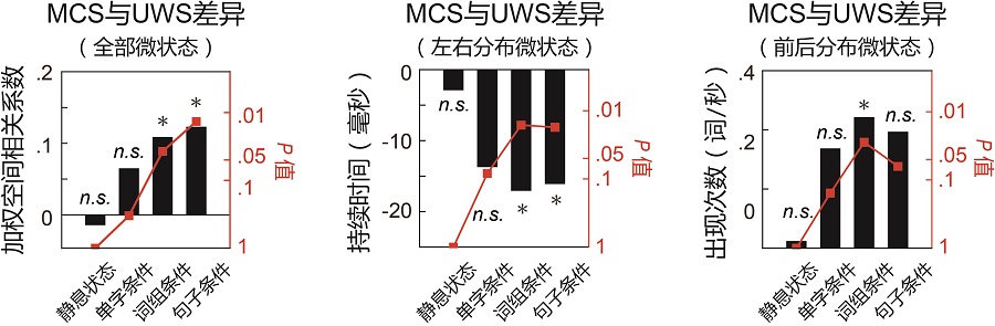 图3、三种脑电微状态参数的最小意识状态与无反应觉醒综合征组间差异随任务中语言层级的提升而加大