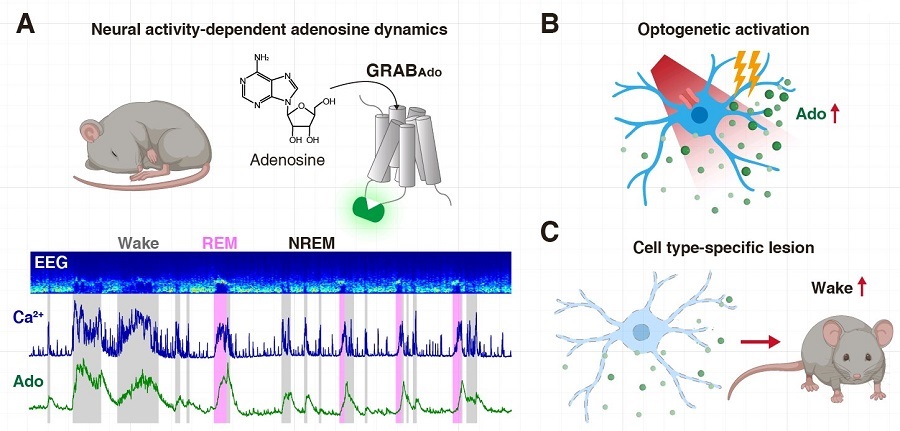 图注:腺苷快速释放和睡眠稳态的神经调控。(A)使用GCaMP和GRABAdo同时记录神经活动和腺苷释放,揭示了睡眠-觉醒周期中小鼠基底前脑区神经活动依赖的快速腺苷释放。(B)光遗传学激活基底前脑区谷氨酸能神经元引起细胞外腺苷的大幅度增加。(C)特异损伤基底前脑区谷氨酸能神经元可降低胞外腺苷水平,并明显增加小鼠的清醒时间。