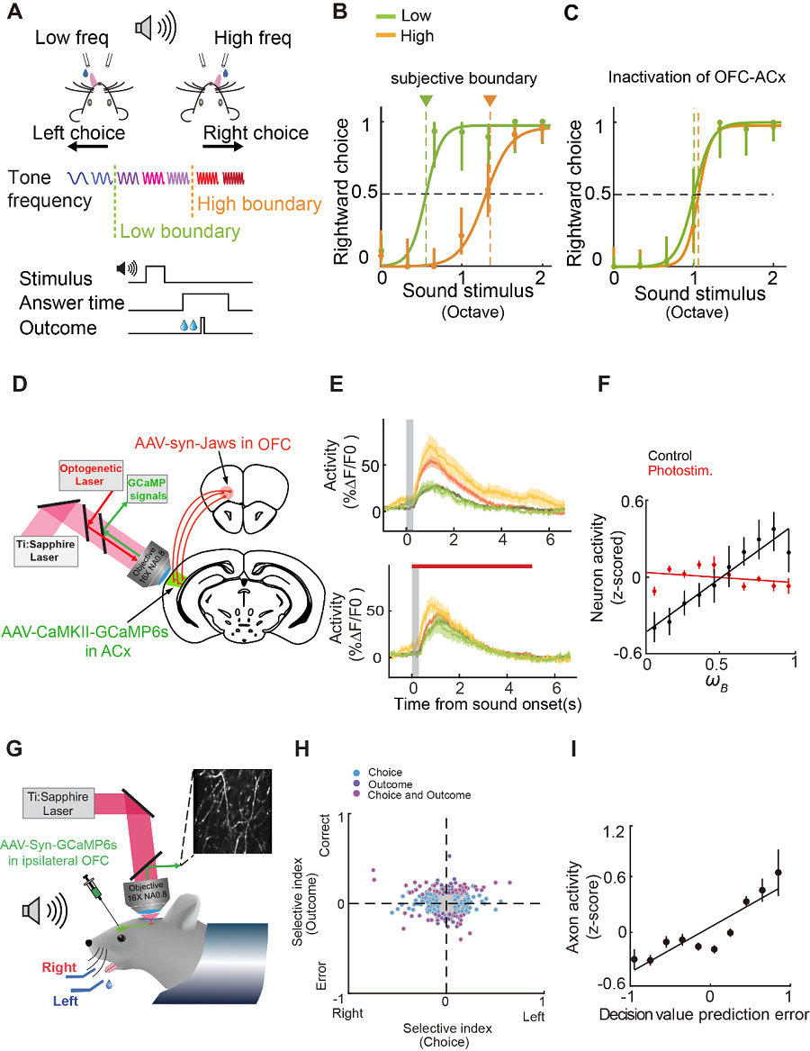 (A)任务设计。小鼠被训练为通过舔左或舔右的行为,报告其对于声音频率的分类,以获得一定量的水作为奖励。任务采用的声音刺激为七个按音程均匀分布在7 kHz到28 kHz之间的纯音。在不同的段落中,声音的分界线分别位于10 kHz(低频分界)和20 kHz(高频分界)。(B)一次实验中不同类型段落里小鼠的心理物理曲线。虚线代表小鼠主观上对于声音刺激频率高低的分界线。误差代表95%的置信区间。绿色为低频分界段落中的心理物理曲线,橙色为高频分界段落中的心理物理曲线。(C)抑制眶额叶-听皮层投射影响了听觉分类的灵活性。(D)在使用双光子在体钙成像记录听皮层神经元活动的同时抑制眶额叶-听皮层投射活动。(E)听皮层中神经元对于段落类型的编码依赖于眶额叶-听皮层投射活动。(F)对于段落类型具有选择性的听皮层神经元活动表征了小鼠对于类别分界线的估计,该信息表征依赖于眶额叶-听皮层投射活动。(G)对眶额叶-听皮层轴突进行双光子在体钙成像记录。(H)眶额叶-听皮层轴突表现出对于小鼠抉择和奖赏的选择性。(I)眶额叶-听皮层轴突活动向听皮层提供了反馈信息。