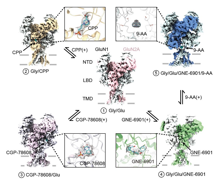 图1 | 冷冻电镜解析不同状态下人源GluN1-GluN2A NMDA受体