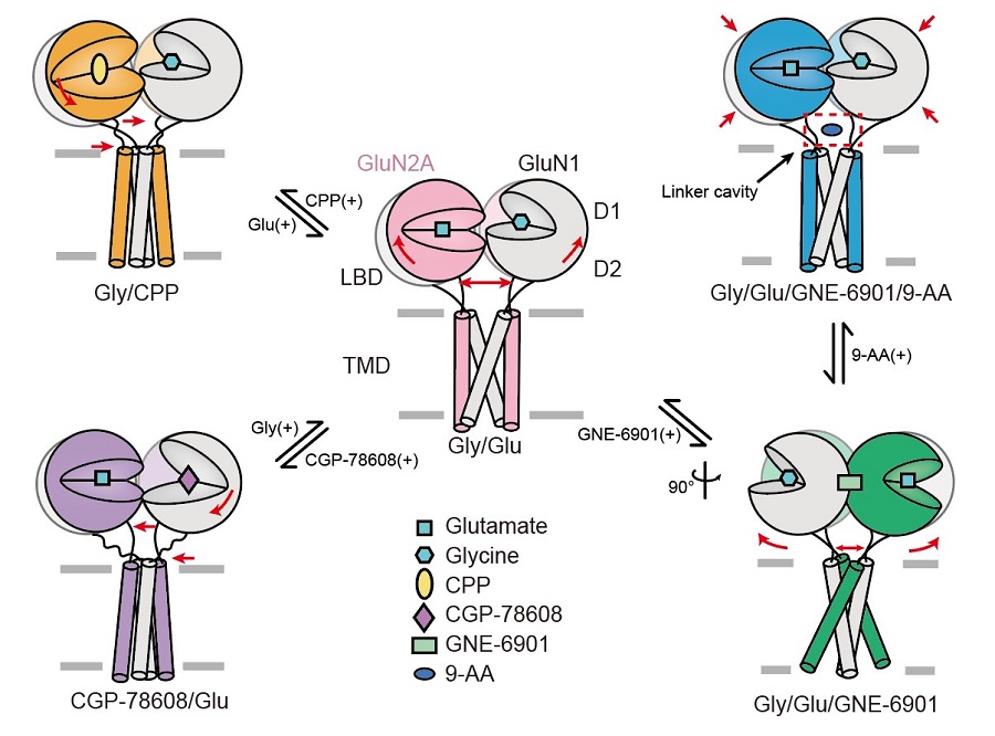 NMDA受体作为一类重要的兴奋性离子型谷氨酸受体,在神经系统发育形成与突触可塑性中发挥重要功能。NMDA受体通常由两个结合甘氨酸的必需亚基GluN1和两个结合谷氨酸的可变GluN2亚基(2A-2D)组成异源四聚体离子通道蛋白。其功能异常与中枢神经系统和精神疾?。ㄈ缫钟糁ⅰ⒕穹至阎?、帕金森病和阿尔兹海默症等)有密切的关联性。这些神经和精神疾病给患者及病人家属带来极大的痛苦,是亟需解决的重要临床难题。因此,深入研究NMDA受体在生理状态下的构象与功能,并揭示全新的小分子结合位点,对于靶向NMDA受体功能异常的新药研发是至关重要的。