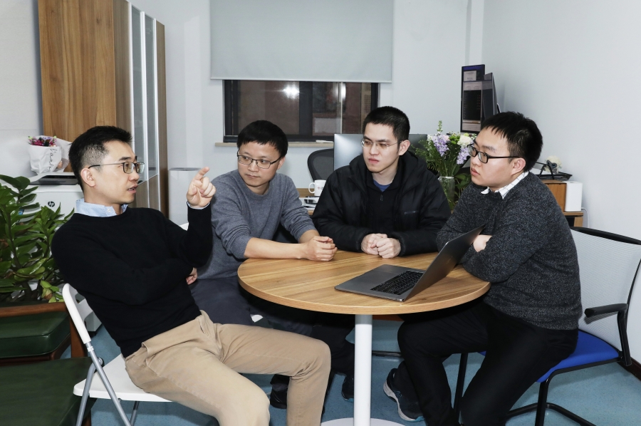 图3:王立平研究员、闵斌副研究员、研究助理胡沛烑、博士后谢洋讨论课题