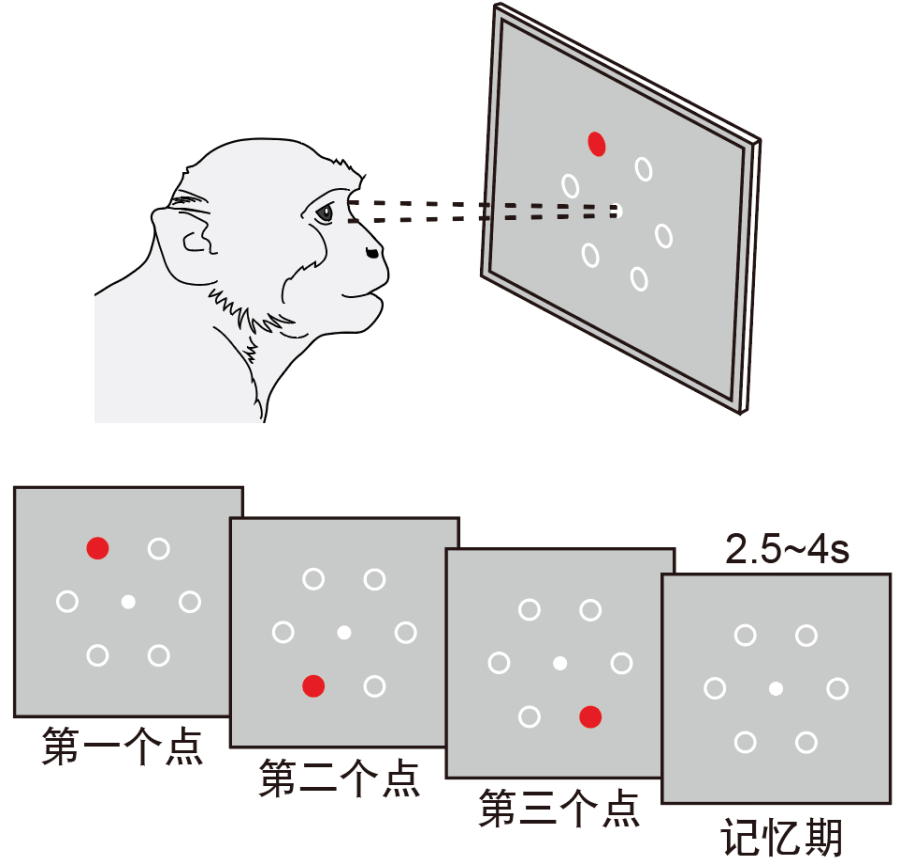 猕猴是演化上最接近人类的模式动物,其认知能力、大脑的结构与功能相比于其他模式动物更接近人类,是研究时间序列等复杂高级认知功能的最佳模型。因此,为了探究时序记忆编码问题,研究人员训练猕猴记忆由多个位置点组成的空间序列(图1)。在任务中,猕猴面前的屏幕上会依次闪现三个不同的点,猕猴需要在几秒钟之后将这些点按之前呈现的顺序汇报出来。在汇报前的几秒记忆保持期内,空间序列的信息便以工作记忆的形式被暂时储存在大脑中。为了记录大脑神经元群体在猕猴进行任务时的活动状态,研究人员对工作记忆的大本营——外侧前额叶皮层进行了双光子钙信号成像。钙信号可反映神经元的脉冲放电活动,而序列信息表征的关键就在记忆期神经元群体的活动模式之中。