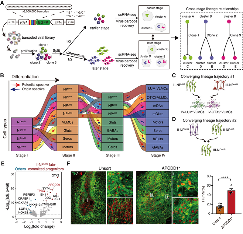 图注:(A)用于跨时间点克隆谱系追踪的SISBAR实验设计示意图。(B)跨越四个分化阶段多层级谱系树,展示了不同分化时间段不同细胞类型之间显著的遗传谱系关系。(C-D)两种不同的汇聚型谱系分化路径示意图。(E)特异性表达在中脑多巴胺能神经元早期前体细胞中的基因。(F)未分选的神经前体细胞和APCDD1+神经前体细胞衍生的移植物典型图和移植物中TH+神经元的比例,hN,人源细胞核。比例尺,大图中为100 μm,小图中为20 μm。