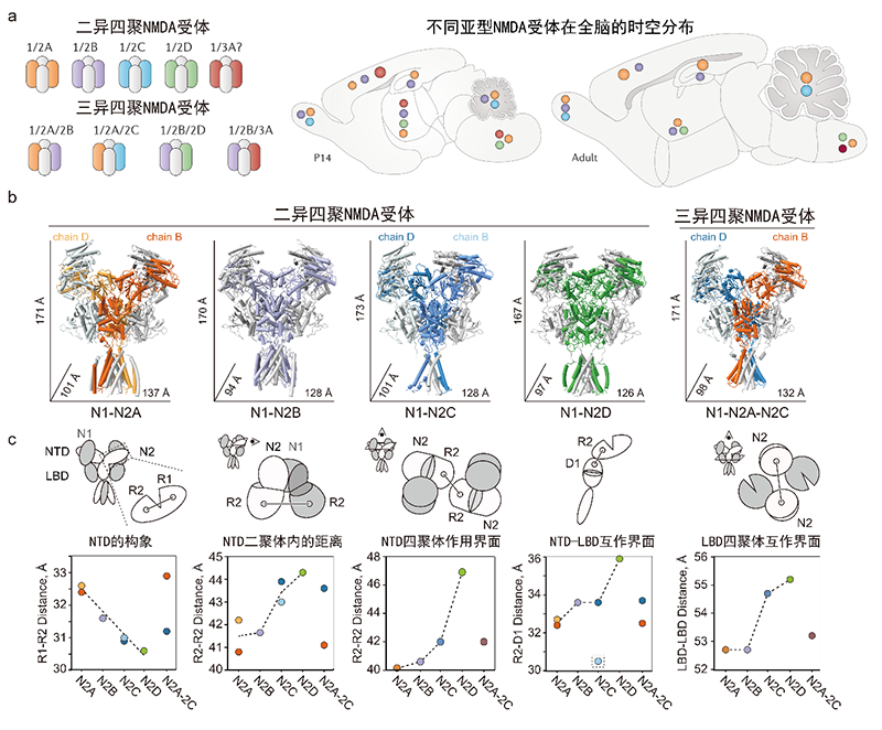 图1.决定不同NMDA受体功能多样性的分子基础。a,不同NMDA亚型在不同发育阶段的全脑分布(引自Paoletti et al., 2013)。b,c,不同NMDA受体亚型的三维结构及决定功能多样性的结构基础。