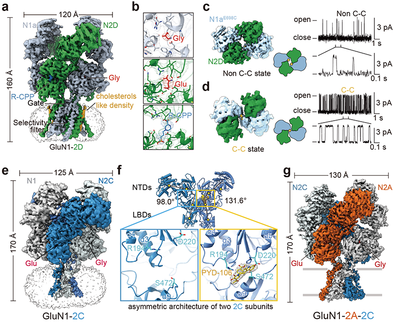 图2. 含有GluN2D和GluN2C受体的三维结构、门控机制和药理学特性。a,GluN1-N2D受体的三维结构。b, 甘氨酸、谷氨酸和竞争性抑制剂R-CPP在其结合口袋中的电子密度云。c, d, GluN1E698C-N2D突变型受体在二硫键交联和非交联状态下的三维构象和单通道性质。e, GluN1-N2C受体的三维结构。f, GluN1-N2C受体的非对称性构象及选择性变构抑制剂PYD-106的结合口袋。g, GluN1-N2A-N2C受体的组装模式和拓扑结构。