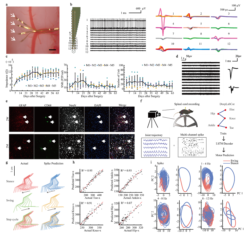 图注 (a) 超柔性脊髓界面手术图。(b) 超柔性脊髓界面急性记录结果。(c) 超柔性脊髓界面的9周内信号追踪情况。(d) 超柔性脊髓界面在植入后一年后的记录情况。(e) 超柔性脊髓界面植入诱发的免疫应答情况。(f) 脊髓神经信号解码行为范式与解码流程示意图。(g) 利用脊髓内神经信号的解码后肢运动轨迹情况。(h) 利用脊髓内神经信号的解码准确率情况。(i) 脊髓内神经信号降维后的神经轨迹。