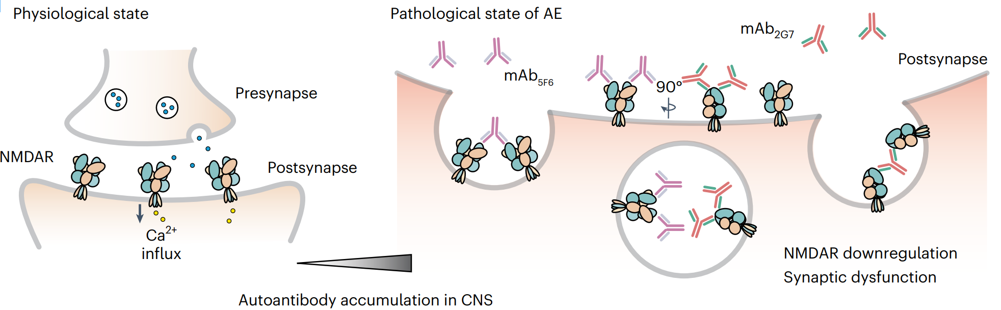 抗NMDA受体脑炎是一种由自身抗体介导的中枢神经系统自身免疫性疾病,是最常见的自身免疫性脑炎类型。NMDA受体是一种在大脑中广泛分布的兴奋性谷氨酸受体,是学习和记忆等认知功能的分子开关。该疾病于2018年被国家卫生健康委员会等五部门纳入第一批罕见病目录,其特点是免疫系统产生致病性自身抗体,错误地攻击大脑中的NMDA受体,导致受体从神经元表面被内吞,从而减弱了NMDA受体在突触传递和功能中的作用(图1)。因此,抗NMDA受体脑炎患者通常伴有精神异常、记忆和认知障碍、癫痫发作、运动障碍、自主神经功能紊乱等多种症状。患者脑脊液和/或血清中的抗NMDA受体抗体是该疾病临床诊断的分子标记物,但这些抗体结合的表位及导致NMDA受体功能障碍的机制一直是领域内的未知。