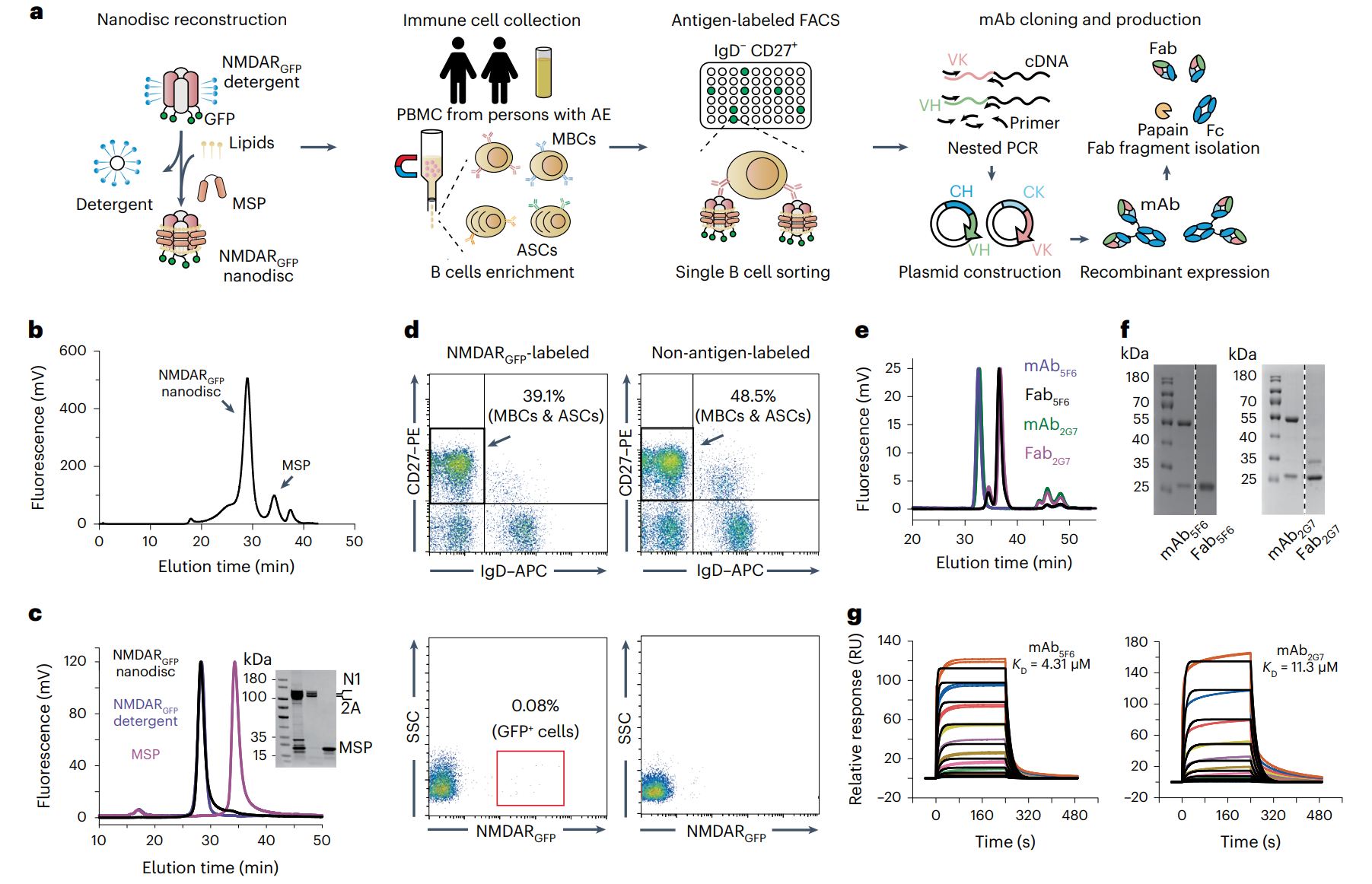 研究团队首先构建了带有GFP标签的NMDA受体纳米盘(NMDARGFP),把它作为结合致病抗体的荧光筛选抗原标记物,标记并分选出来自抗NMDA受体脑炎患者血液样品里的单个B细胞。通过流式分选出抗NMDA受体脑炎外周血单个核细胞中IgD-CD27+的B细胞,发现其中约0.08%的B细胞被NMDARGFP标记。对这些GFP标记的细胞进行单细胞分选并收集,通过逆转录并扩增出编码轻链和重链可变区域的致病单抗序列。基于活细胞染色及表面等离子共振,鉴定和分析这些致病单抗与NMDA受体的结合特性(图2)。