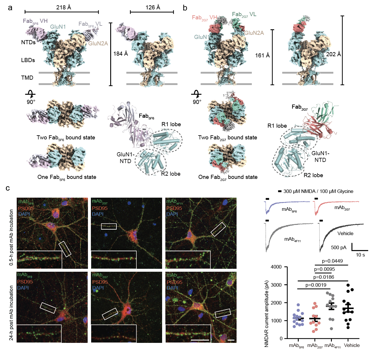 随后,研究团队选取两个代表性单抗mAb5F6和mAb2G7,通过单颗粒冷冻电镜发现这些自身抗体与GluN1必需亚基N末端结构域中的R1-lobe结合(图3)。把NMDA受体上关键氨基酸做单点突变,就可以显著性降低致病抗体的结合。研究人员通过同步辐射溶液小角X射线散射方法,在近生理溶液条件下揭示了NMDA受体和抗体复合物呈现2:1或1:2的化学计量比,这种结合模式使得自身抗体引起NMDA受体的聚集和内吞。