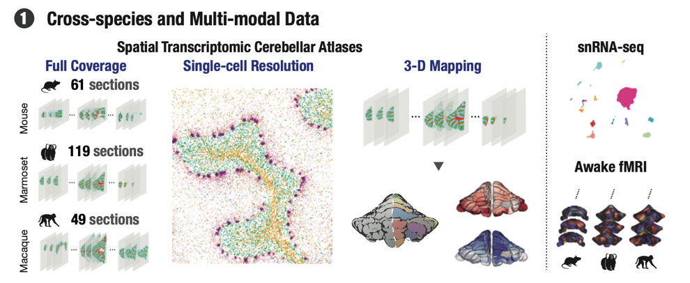 近年来,单细胞组学的发展推动了多个针对小脑细胞构成研究的开展,但此前对小脑皮层细胞的分子和功能多样性的研究主要基于小鼠小脑。灵长类动物小脑在进化过程中显著扩张,神经元数量增加,认知功能更为复杂,因此确定是否存在灵长类特异性细胞亚型及其独特的空间组织形式,对于研究灵长类特异性的小脑功能具有重要意义。然而,由于小脑除了占小脑神经元数量99%以上的颗粒细胞外,大多数细胞类型难以富集,因此对整个灵长类小脑进行单细胞分辨率的全面空间基因表达谱分析一直具有挑战性。