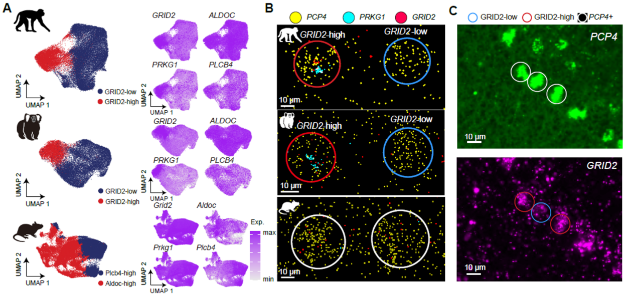 特别值得注意的是,研究人员在Stereo-seq数据中发现了灵长类特异性的浦肯野细胞亚型(GRID2-high Purkinje),并通过RNAscope实验和人类的单细胞转录组数据验证了这一发现。进一步的研究还揭示了GRID2高表达细胞在诱导长时程抑制(LTD)相关基因表达方面的显著差异,以及与其他谷氨酸受体亚基表达模式的差异。