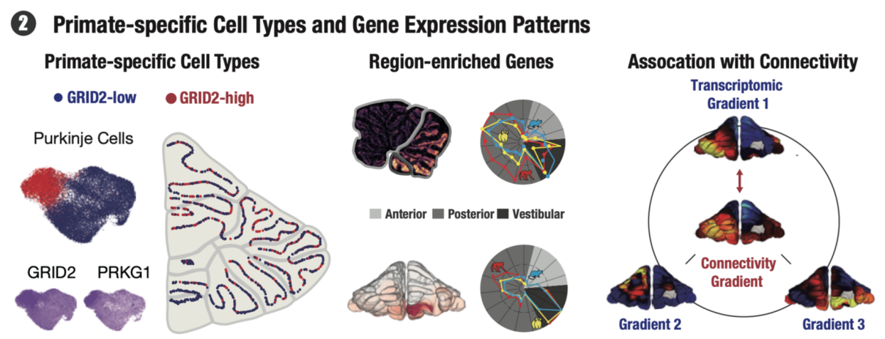 通过收集和分析清醒小鼠、狨猴以及公开的猕猴的静息态fMRI数据,研究人员发现了小脑皮层内的功能连接梯度,即“小脑内功能梯度”。这些梯度展示了不同小脑区域之间连接性的三维空间模式。通过实现空间转录组的三维重建和梯度分析,研究人员近一步发现,在所有三个物种中,功能梯度1和转录组梯度1都显示出明显的前后差异,且猕猴和狨猴之间的空间模式相似性高于它们与小鼠之间的相似性。此外,通过跨物种预测模型的验证,发现了基因表达与小脑内功能连接之间的密切关系,并且确定了与功能梯度相关的基因。这些基因在不同物种中的表达模式和富集的细胞类型存在差异,进一步强调了物种间的分子和功能差异。