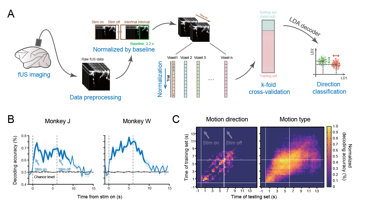 在测量到可靠稳定的功能超声信号的基础上,研究者通过线性判别分析方法,发现基于单试次的血流信号即可高准确地解码自身运动的方向,如前后和左右加速平移,以及自身运动的类型,如平移和围绕头-身体轴的旋转(图二)。这种解码能力,为今后基于微创的大脑信号读取和应用外设以帮助患者实现日常生活中的自身运动打下了基础。