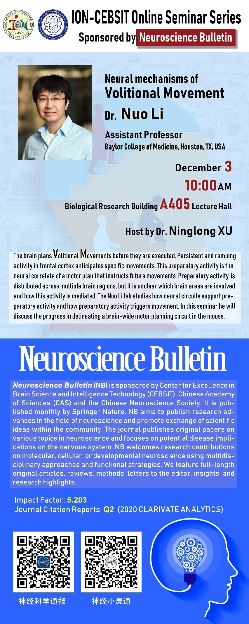 2021年12月3日,由中科院脑科学与智能技术卓越创新中心发起主办,Neuroscience Bulletin协办的系列学术报告会第五期成功举办。