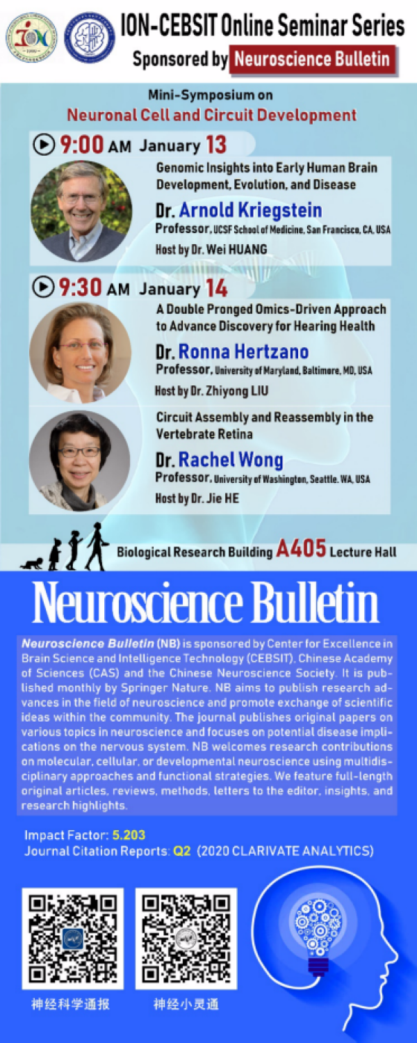 2022年1月13日和1月14日,Neuroscience Bulletin脑智卓越中心系列学术报告2022年首期报告会成功举办。该系列学术报告由中心学术活动委员会发起主办,Neuroscience Bulletin协办,旨在邀请国际知名的科学家与脑智卓越中心科研人员以及国内外同行进行学术交流。